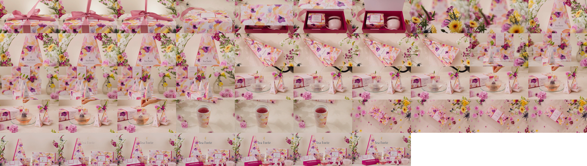 - One Mini Petite Presentation Box of 10 pyramid tea infusers, two of each blend: Moroccan Mint (green tea), White Ginger Pear (white tea), Chamomile Lavender (herbal tea), Raspberry Nectar (herbal tea), and Pink Papaya Nectar (herbal tea).